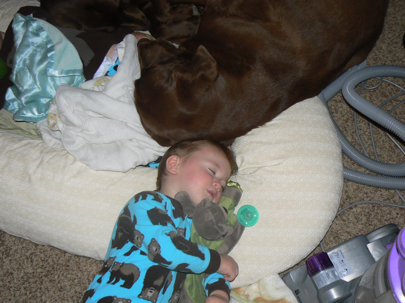 The boys just couldn't help but fall asleep in my favorite pillow (snoogle) from pregnancy and well, the dogs always prefer to sleep with a pillow (if allowed). Actually, more often than not, our dogs seek out the boys pillows or blankets and use them properly, as if laying in the just the carpet wasn't comfortable enough. Needless to say, this really makes Mason mad (even if we are laying on it with him!). He'll go over the dog, pull at the pillow and "yell" at the dog. It's kinda cute and I sometimes feel bad for having to constantly scold the dogs for it.